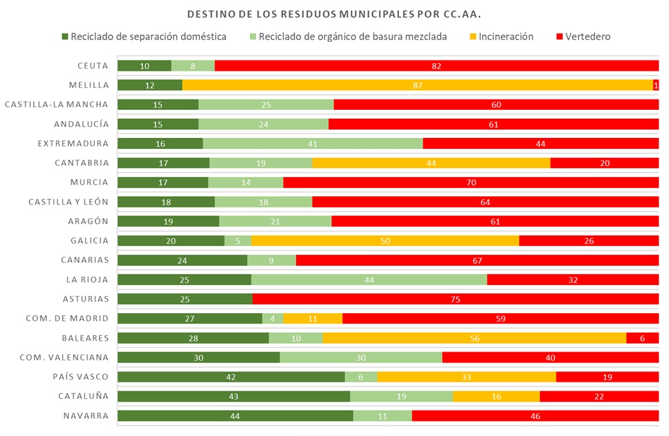 Exceso de vertido. La fracción eliminada en vertedero en algunas regiones es extremadamente elevada como es el caso de Ceuta (87 %), Asturias (75 %), Murcia (70 %), Canarias (67 %). En muchas otras ronda el 60 % (Castilla-La Mancha, Andalucía, Castilla y León, Aragón, Canarias, Comunidad de Madrid). Extremadura y Navarra se sitúan sobre la media estatal (44-46 %).