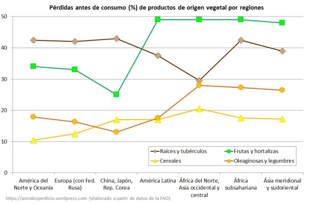 Se observa claramente cómo en el segmento de frutas y hortalizas las pérdidas antes del consumo son extremadamente elevadas en las regiones menos desarrolladas, si las comparamos con las estimadas en las regiones más desarrolladas (donde también son altas en cualquier caso).