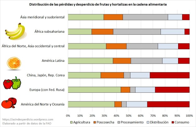 Una vez descritos en una entrada anterior los datos de la FAO sobre el conjunto de pérdidas y desperdicio de alimentos en el mundo, vamos a profundizar en su análisis, atendiendo a los diferentes tipos de alimentos, y al origen de las pérdidas a lo largo de la cadena alimentaria, haciendo incapié en las diferencias entre las regiones más ricas y las menos desarrolladas.