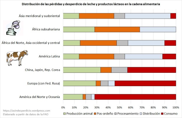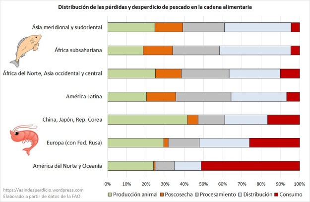 Las pérdidas más importantes se producen en las fases previas al consumo, en todos los alimentos y en todas las regiones consideradas, con la excepción de los cereales, la carne, la leche y productos lácteos, cuyas pérdidas en consumo en las dos regiones más ricas del mundo superan o igualan a las pérdidas en las etapas previas de la cadena. También ocurre esto en el segmento del pescado en la región «América del norte y Oceanía», donde se han estimado pérdidas en el consumo muy superiores al resto del mundo.