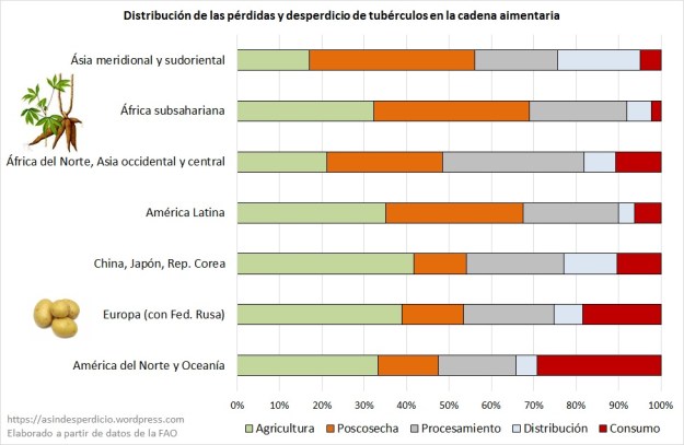 Raíces y tubérculos. En los países de igresos altos y medianos (Asia industrializada) hay una gran pérdida en la fase de producción agricola. En los países de ingresos bajos, además de la producción primaria, adquiere mucha importancia las etapas de poscosecha y almacenamiento.
