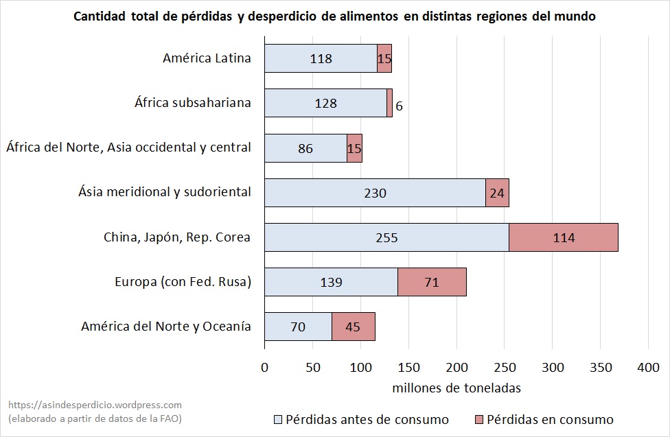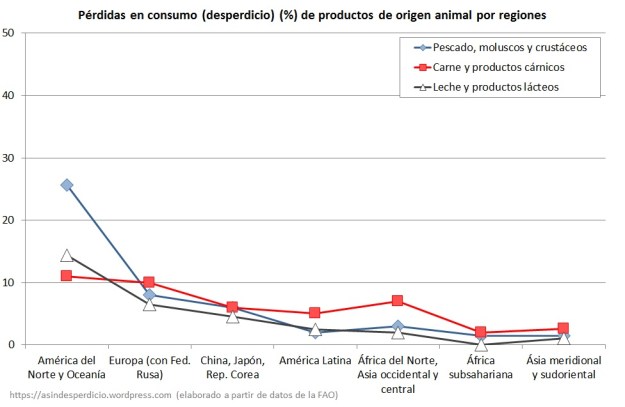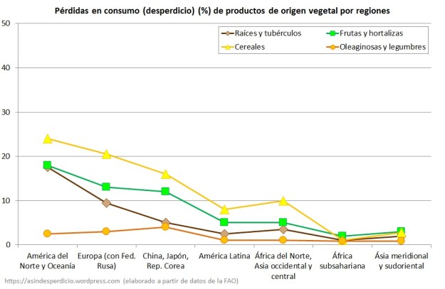 Como ya se ha señalado en otras ocasiones, el desperdicio en el consumo es muy significativo en las regiones más desarrolladas, destacando el desperdicio de cereales, frutas y hortalizas, raíces y tubérculos y pescado. En las regiones más desfavorecidas del mundo el desperdicio es mínimo.