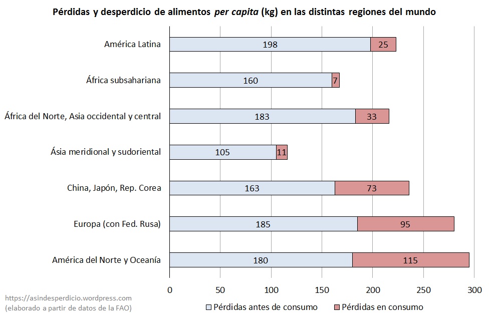 - Europa y América del norte y Oceanía, en las que se estima que alrededor del 35-40 % de las pérdidas se producen en el punto final de la cadena (95-115 kg per capita). En estas regioneshabita el 17 % de la población mundial, generan el 25 % de las pérdidas mundiales totales, el 21 % de las pérdidas producidas en los eslabones de la cadena alimentaria previos al consumo, y concentra nada menos que el 41 % del desperdicio.
