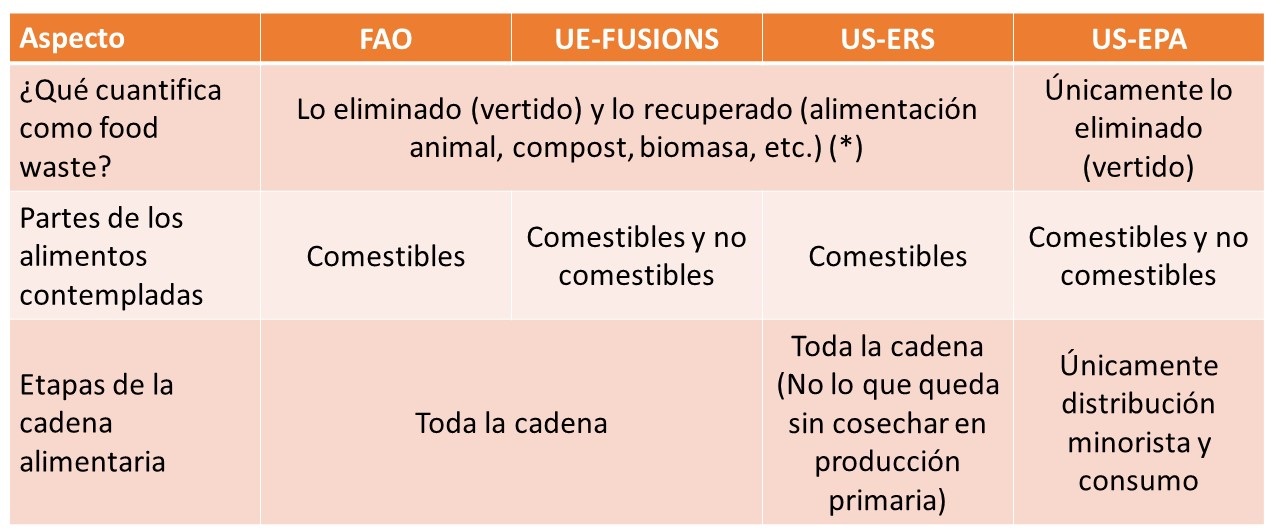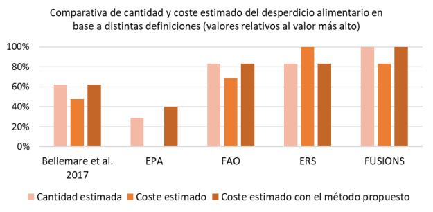 - La mayor parte se limitan a cuantificar los alimentos en unidades de masa, mientras que muy pocas hacen referencia al valor calórico de PDA, que representaría mejor el valor nutricional y el nivel de recursos perdidos en la producción de las PDA. En 1 kg de lechuga hay un valor calórico mucho menor que en 1 kg de carne, y los recursos necesarios para producir el primero son también mucho menores que los requeridos para el segundo.