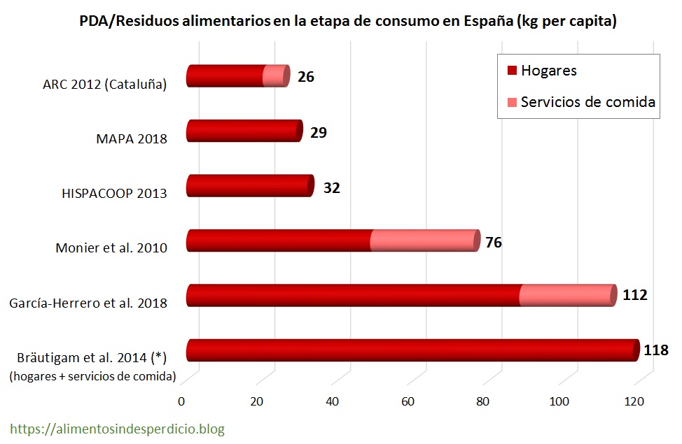 Los estudios de Bräutigam et al. (2014) y García-Herrero et al. (2018) dan pérdidas en consumo superiores a 110 kg per capita. Este último diferencia entre consumo en hogares (88 kg) y consumo fuera del hogar (24 kg). Estos valores son superiores a los señalados por la FAO (2011) para Europa (95 kg), y por Monier et al. (2010) para España (49 kg en hogares, 27 fuera del hogar). Pero lo que llama mucho la atención es que en los tres estudios sobre desperdicio de alimentos en los hogares realizados específicamente en España y Cataluña las cifras son mucho menores, situándose entre 20 kg (ARC, 2012) y 32 kg (HISPACOOP 2013).