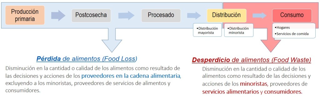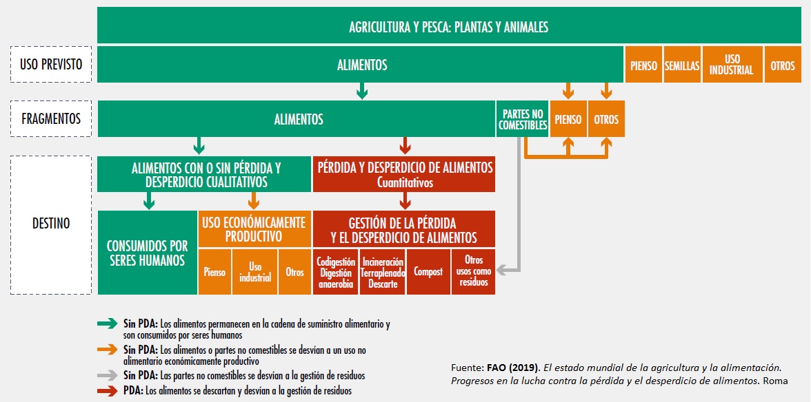 (1) Hasta hace poco (FAO,2014), todas las PDA se consideraban pérdidas. El desperdicio formaba parte de las pérdidas de alimentos, aunque se mantenía el término debido a que había arraigado en todos los ámbitos (político, académico, etc.). Ahora, como en sus orígenes, la FAO vuelve a separar los dos conceptos, atendiendo a la parte de la cadena alimentaria considerada. Así, la FAO dice ahora que:(2) Por otra parte, en las definiciones anteriores de PDA de la FAO no se tenía en consideración el destino de las mismas. Todos los materiales (solo las partes comestibles) que salían de la cadena alimentaria se consideraban pérdidas y desperdicio. Ahora no: