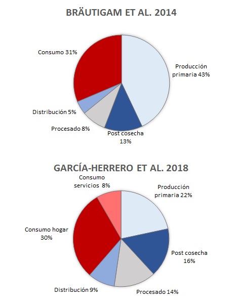 En la figura anterior aparecen las PDA y/o residuos alimentarios (kg por persona y año) estimados a lo largo de la cadena alimentaria en tres estudios: el muy conocido y citado de Monier et al. (2010), prácticamente la única referencia citada hasta hace poco cuando se trata de datos sobre PDA en España, el estudio de Bräutigam et al. (2014) que aplica la metodología del estudio de la FAO (2011) para distintos países de la UE-27; y el reciente estudio realizado por García-Herrero et al. (2018), en el que participan las universidades de Cantabria, Pompeu Fabra y Pontificia Católica de Perú.
