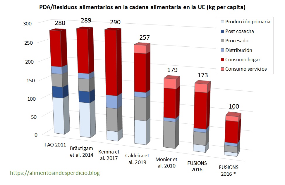 En la figura anterior aparecen los kg de PDA (y/o residuos alimentarios) per capita en Europa de acuerdo a 6 referencias distintas, las 3 ya señaladas en la entrada anterior (FAO 2011, Monier et al., 2010 y FUSIONS 2016) y otras 3 no citadas previamente (Bräutigam et al., 2014; Kemna et al., 2017; y Caldeira et al., 2019). Las referencias y sus enlaces aparecen al final de la entrada.