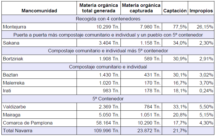 En el documento se señala por ejemplo, que efectivamente la recogida separada de materia orgánica está extendida en casi toda la geografía navarra, en un 83 %, pero que su tasa de éxito, es decir, la materia orgánica realmente recogida o capturada, todavía es baja, un 22 % en 2019. En la Comarca de Pamplona, donde se generan más de la mitad de los residuos domiciliarios de Navarra, fue aún menor, un 18 %.