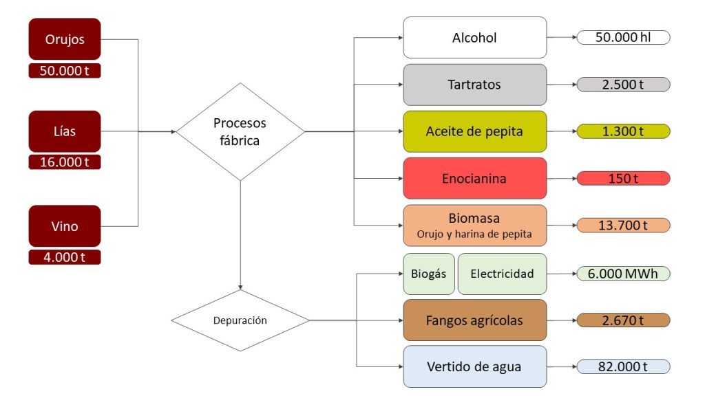 El sector que mejor se ha podido caracterizar en este trabajo es, sin duda, el vinícola, tanto en relación al volumen como al destino y formas de valorización de los subproductos generados. La casi totalidad de los orujos y lías de las bodegas navarras (20.000-27.000 t) van a parar a una única empresa (AGRALCO, situada en Estella, ver entrada previa) que puede definirse como una biorrefinería en la que son sometidos a múltiples procesos de valorización y depuración (figura 4) dando lugar a diferentes productos, como alcohol, colorante, aceite de semillas, tartratos, fangos agrícolas, además de energía térmica a través de la incineración de los residuos restantes. Es por lo tanto el sector de la industria alimentaria con el mayor grado de “circularidad” en la gestión de los flujos de materiales orgánicos generados.
