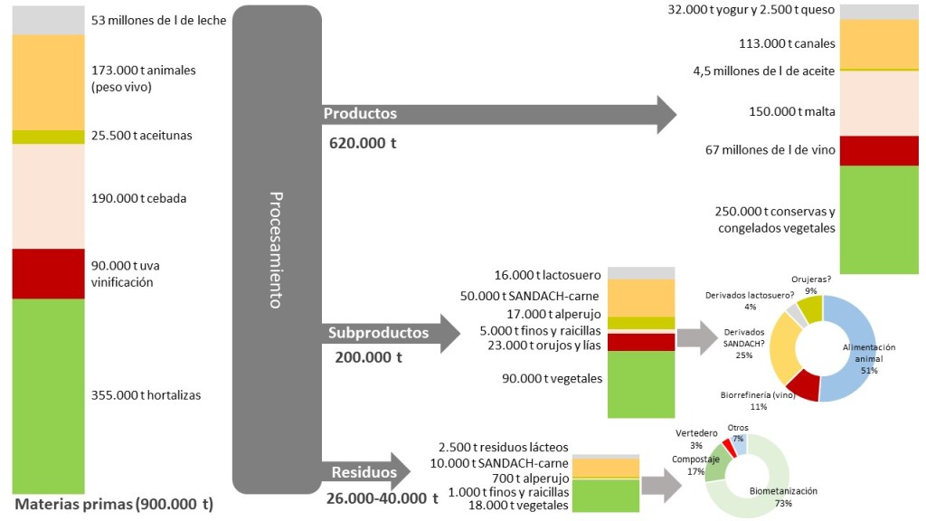 El sector que genera más subproductos es evidentemente el de transformación de vegetales que produciría en torno a 90.000 t de subproductos, estimación mucho menor de la cifra real, por los motivos señalados antes (para corroborarlo, ver entrada posterior sobre un estudio realizado por el Consocio EDER en 2023. En este estudio sobre una muestra amplia pero no completa de las empresas de este sector, la cifra de subproductos ronda el valor de 200.000 t). En cualquier caso, lo que sí parece claro es que el destino final es, casi en su totalidad, la alimentación animal, bien de forma directa (a través de acuerdos o contratos entre explotaciones ganaderas y las industrias), o previa transformación para la obtención de piensos, en plantas como la de la empresa TRASA, tal y como se describe en una entrada previa.