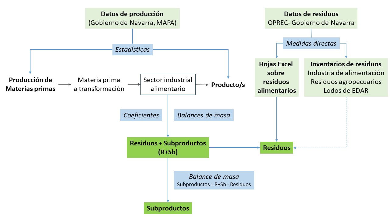 Por otra parte, se calculó de forma estimativa el conjunto de residuos más subproductos (R+Sb) generado en cada sector industrial a través de ecuaciones de balance de masa basadas en datos estadísticos sobre producción de materias primas y/o productos, y en coeficientes de generación de R+Sb seleccionados tras una revisión bibliográfica. Conocidas las cantidades de residuos y de R+Sb se pudo estimar que parte de los últimos debían ser considerados subproductos.