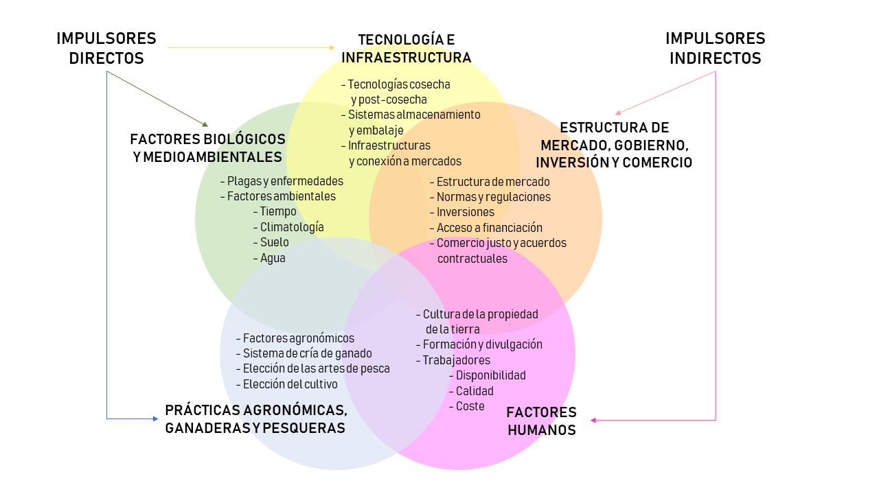 El informe presenta diferentes estudios de caso y, en base a los mismos, concluye que detrás de las pérdidas de alimentos en el sector primario existen impulsores directos que tienen que ver con factores biológicos y medioambientales, técnicos (prácticas agronómicas, ganaderas y pesqueras), tecnológicos y de infraestructura. Todos estos factores tienen multitud de interacciones entre sí y, muy importante, con otros factores o impulsores indirectos que tienen que ver con el factor humano, y con aspectos políticos y de mercado (figura 3).