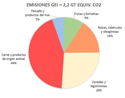 Emisiones GEI = 2,2 Gt de equivalentes de CO2, distribuidos en función de la categoría de alimentos de acuerdo a lo que aparece en la figura 2.