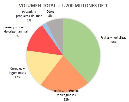 El informe da un valor global de 1.200 millones de toneladas, de las que más de un 75 % son productos de origen vegetal, destacando los más perecederos como frutas, hortalizas, raíces y tubérculos (figura 1). Este volumen de pérdidas supone un 15,3 % de la producción total de alimentos, distribuido entre un 8,3 % en cosecha y un 7,0 % en las actividades post-cosecha.