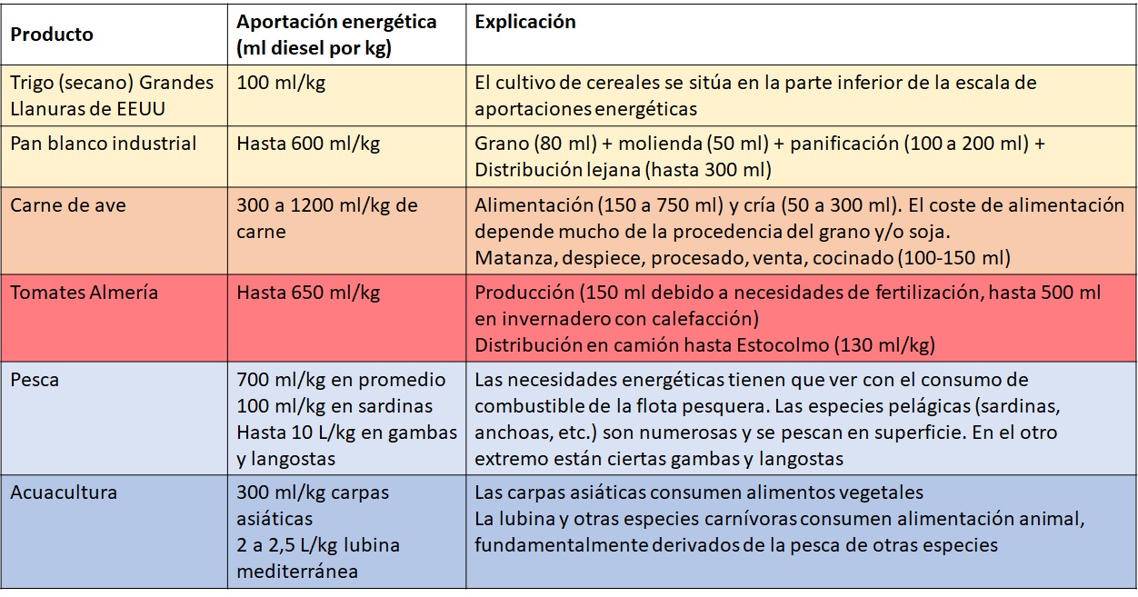 Para hacer más gráfica dicha contribución y comparar las necesidades energéticas de productos de diferente naturaleza el autor cuantifica y expresa dichas necesidades en en forma de volumen de diesel (ml, L) por kg de producto (aunque en la práctica no todas las aportaciones energéticas se concreten a través del uso de dicho combustible, evidentemente). Esto se resume en el cuadro siguiente: