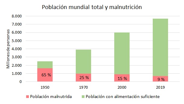 La revolución industrial provocó un aumento muy considerable de la demanda alimentaria de la población urbana, lo que obligó a un incremento de la producción de comida, asociado en el siglo XIX en gran medida al aumento de la superficie de cultivo (en América principalmente). Es en el siglo XX, particularmente tras la segunda guerra mundial, donde la transformación de la agricultura se acelera. El autor señala literalmente que «ninguna transformación reciente ha sido tan fundamental para la existencia como nuestra capacidad de producir, año tras año, un exceso de comida«. Y lo ilustra a través de los datos que aparecen en la figura siguiente, donde se puede apreciar que en el plazo de setenta años la población mundial se ha triplicado mientras que la proporción de población desnutrida ha pasado del 65 % (2 de cada 3 personas) a menos del 9 % (1 de cada 11 personas).