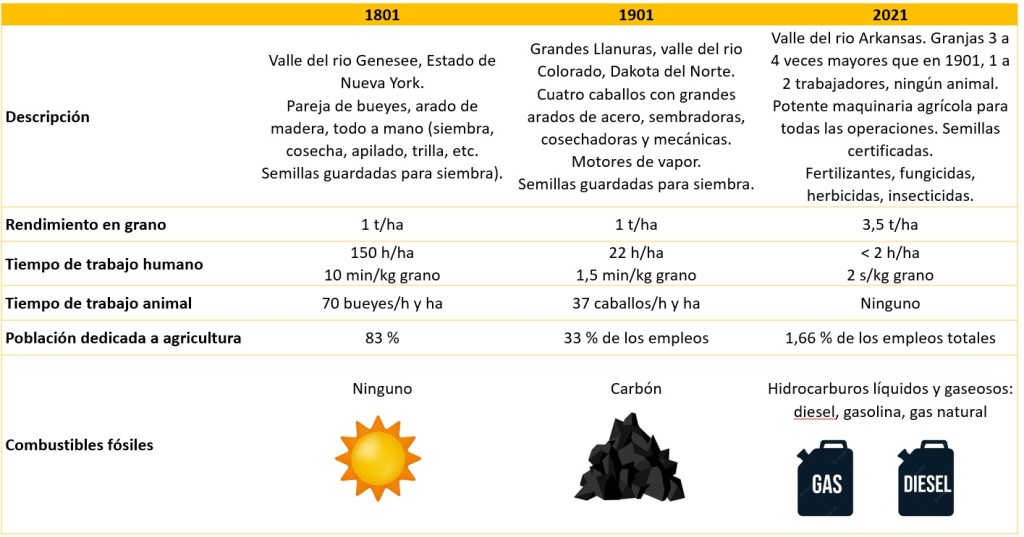 Esta transformación de la producción agrícola y su dependencia actual de los combustibles fósiles los ilustra describiendo las principales características de la producción de trigo en Estados Unidos en 1801, 1901 y en la actualidad. En la figura siguiente se esquematiza esto: