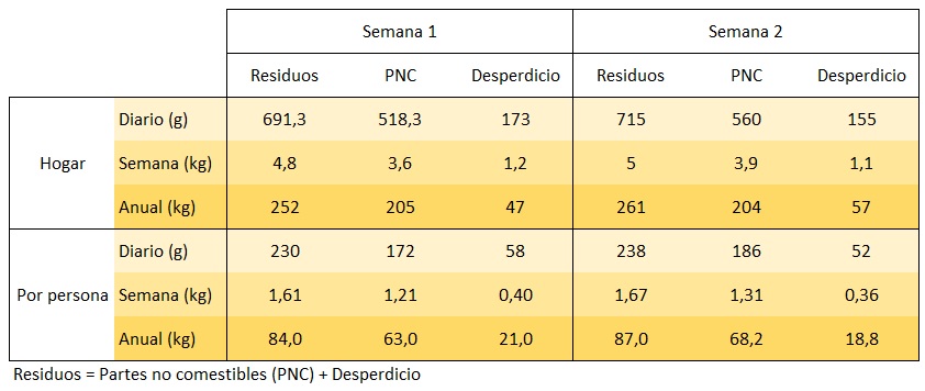 Se observa que en la casa ambas semanas la cantidad de residuos generados fue bastante similar, alrededor de 700 gramos diarios, 5 kg en toda la semana, lo que supondría un poco más de 250-260 kg al año. Si dividimos estas cifras entre tres, los residuos por persona son 230-240 g diarios, 1,6-1,7 kg por semana y 84-87 kg al año. Al atender a la distribución de estos residuos entre las partes no comestibles y el desperdicio los resultados cambian un poco de una semana a otra. La primera semana el desperdicio fue mayor, supuso el 25 % de todos los residuos alimentarios, mientras que la segunda semana fue el 22 %. En promedio tendríamos una tasa anual de 85,4 kg de residuos alimentarios per capita, de los cuales un 23,5 % sería claramente desperdicio, es decir, 19,9 kg.