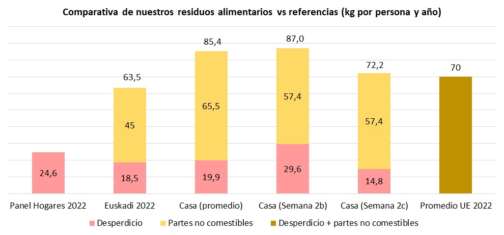 La generación promedio de residuos alimentarios en nuestra casa (85 kg) es un 22 % superior al promedio europeo y un 35% al de nuestros vecinos del País Vasco.