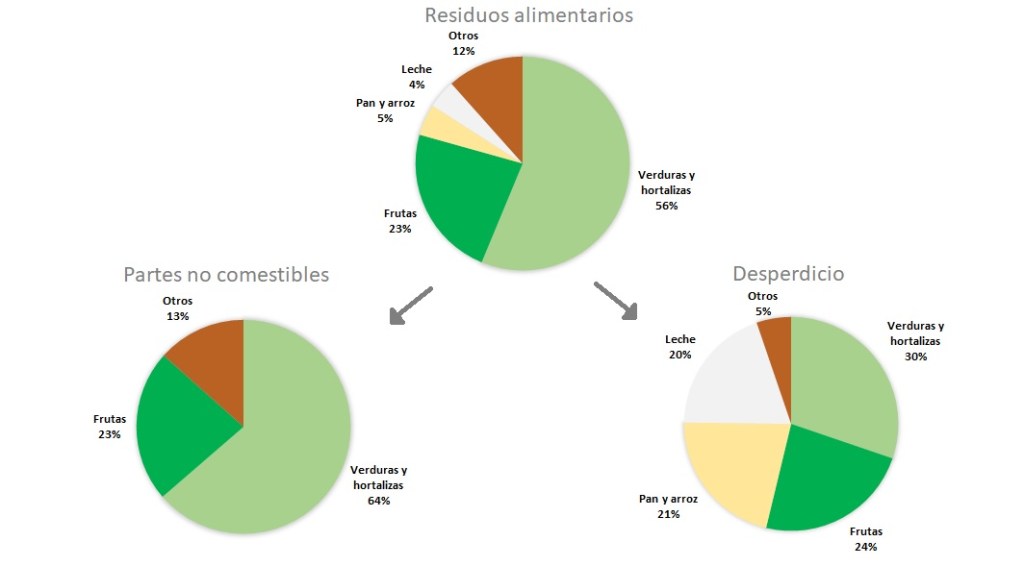 Figura 3. Distribución por grupos de alimentos de los residuos alimentarios y de sus partes no comestibles y comestibles (desperdicio)
