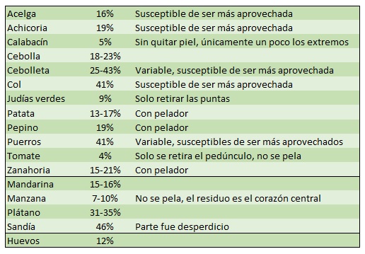 Tabla 2. Porcentaje de las materias primas retirado en la preparación o consumo. Nota: se puede ver que para pelar patatas, zanahorias o pepinos, empleamos siempre un pelador. Nunca empleamos un cuchillo, con el que podríamos aumentar entre 5 y 10 puntos porcentuales la proporción de material retirado en el pelado, según comprobaciones propias.
