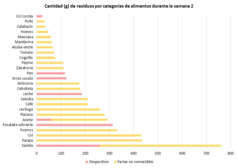 Figura 2. Cantidades de diferentes alimentos tiradas a la basura en nuestra casa durante la segunda semana