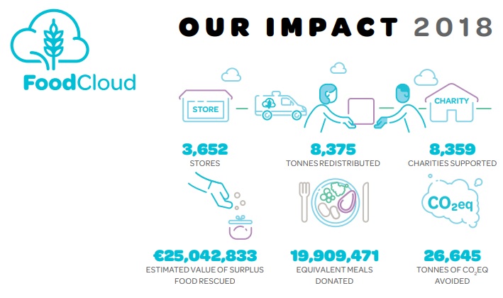 FoodCloud. (Irlanda y Reino Unido). App orientada a la «redistribución de alimentos». Permite conectar establecimientos de venta de alimentos con entidades de caridad de cara a suministrarles productos alimentarios excedentarios. Tiene más de 10.000 descargas, cifra que que, teniendo en cuenta que no es una aplicación orientada a los consumidores finales, sino a entidades, es elevada. En la siguiente figura se ilustra el impacto de la aplicación en 2018, que parece muy destacable.