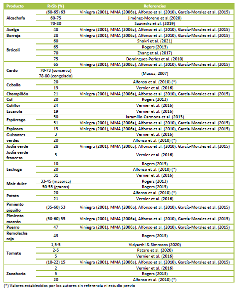 Tal y como se puede ver en la figura anterior, las 35 empresas analizadas procesan anualmente una cantidad muy elevada de materias primas, cercana a 800.000 toneladas, que dan lugar a algo más de 570.000 t de productos finales. En este procesado se generan unas mermas o restos del orden de 220.000 toneladas. Suponen, en promedio el 27,5 % de las materias primas, pero este porcentaje varía ampliamente de unas categorías a otras. Así, ronda el 70 % en el caso de las alcachofas, cardo, maíz; el 50 % para espárragos, pimientos, borraja; el 30-35 % para la cebolla, brócoli, acelga, judías verdes, lechugas; el 11-19 % para puerro, patata, guisantes; y del 10 % o menos para tomate, espinacas, coliflor, legumbres, etc.